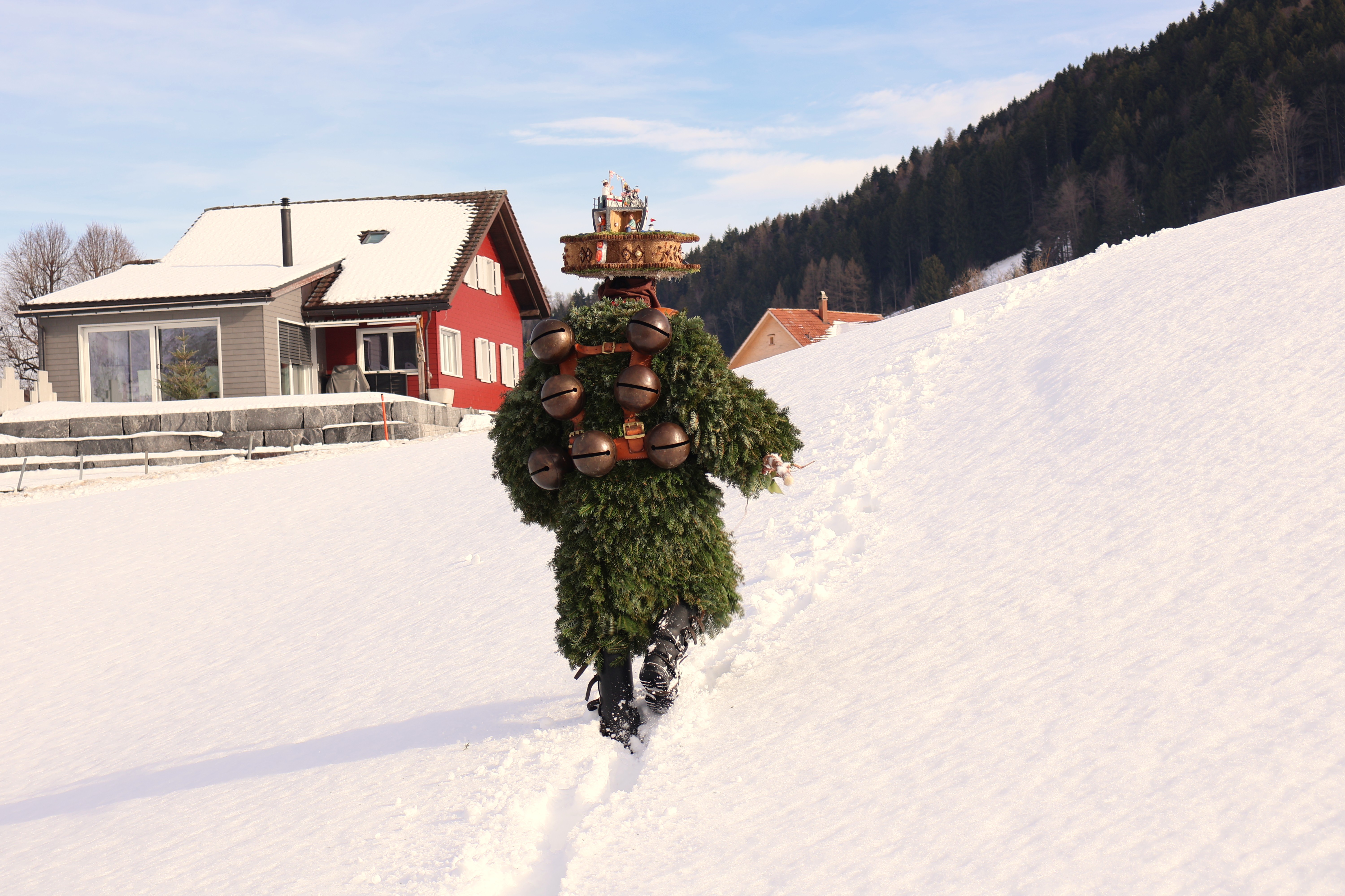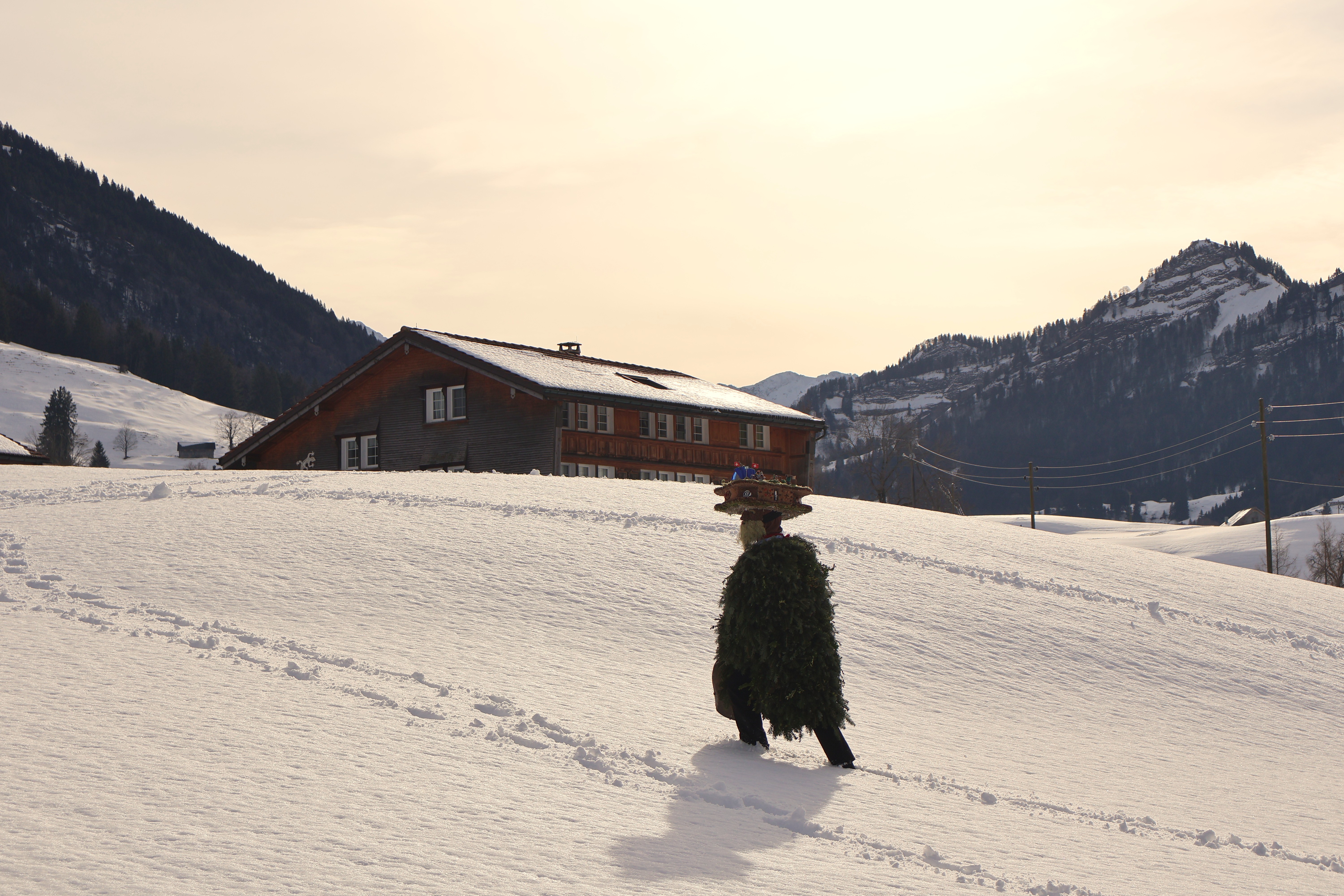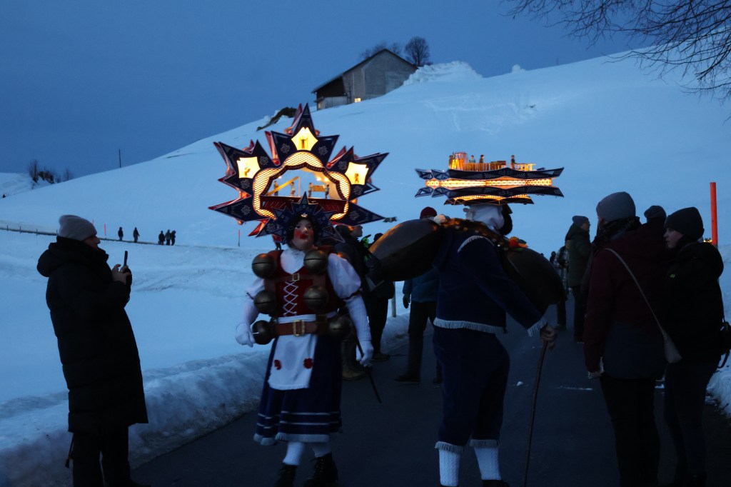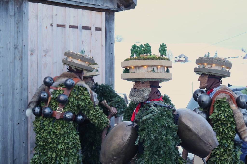 Dans la nuit, on rencontre un premier groupe d’environ 6 hommes-sapins qui chantent du yodel devant une ferme. Les fermiers sont dehors et écoutent silencieusement. A la fin de chaque chanson, les hommes-sapins se secouent faisant tinter leur grosse cloche unique ou leurs grelots. Les fermiers leur servent de l’eau, ou du vin blanc avec une paille. Après une quinzaine de minutes de chant, les hommes saluent d’une poignée de main le chef de famille qui leur glisse un billet dans la paume et s’en vont en courant à la file indienne. Ils portent des bottes en cuirs avec des boucles, sont recouverts de branches de sapin ou de gui, portent une cloche unique ou plusieurs grelots, cachent leur visage avec un masque recouvert d’écailles de pin et d’une barbe de lichen et arborent une coiffe en carton sur laquelle de petites figurines immortalisent une scène de vie locale. Dans la nuit, de petites lumières permettent de distinguer tous les détails de leur habit éphèmère.