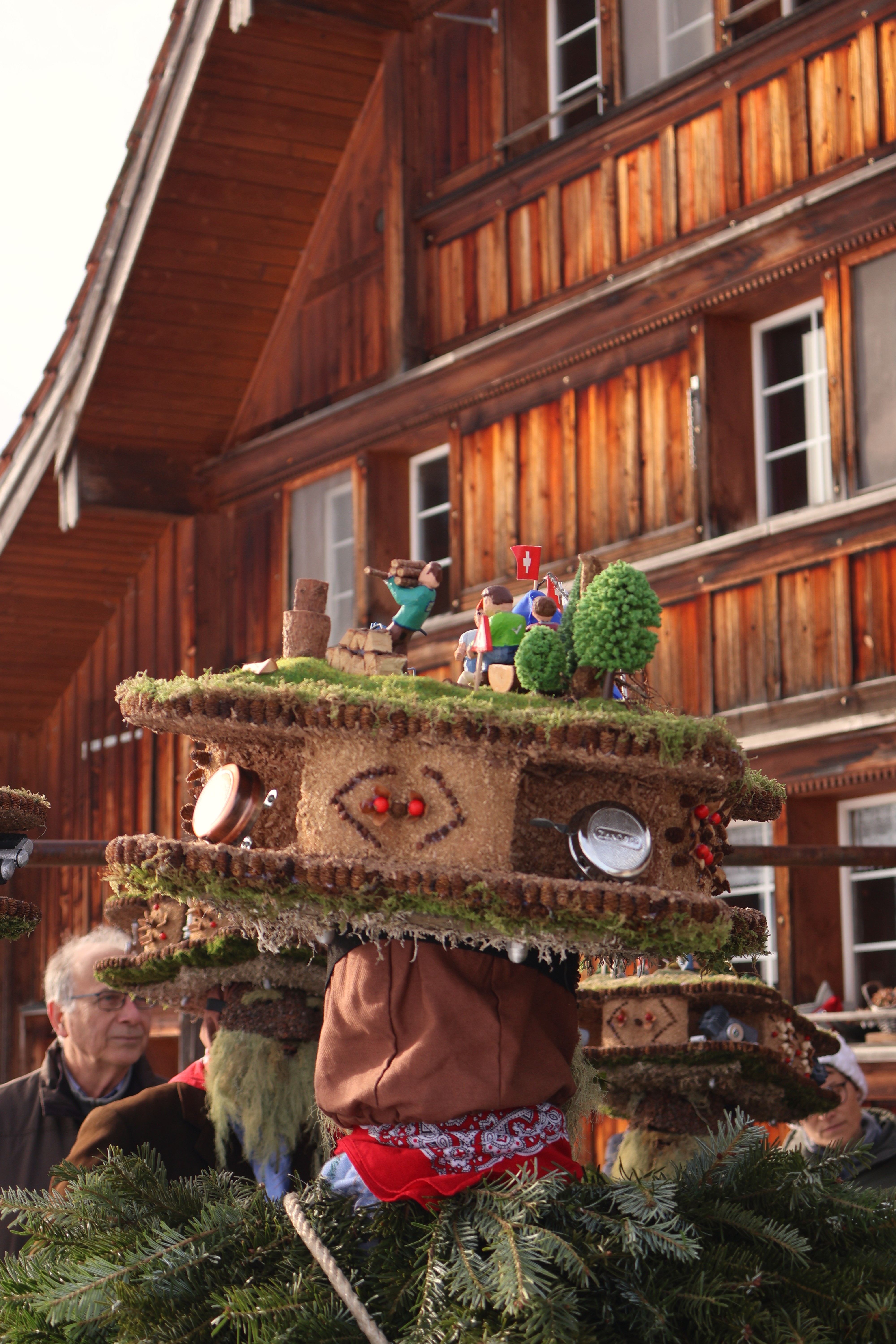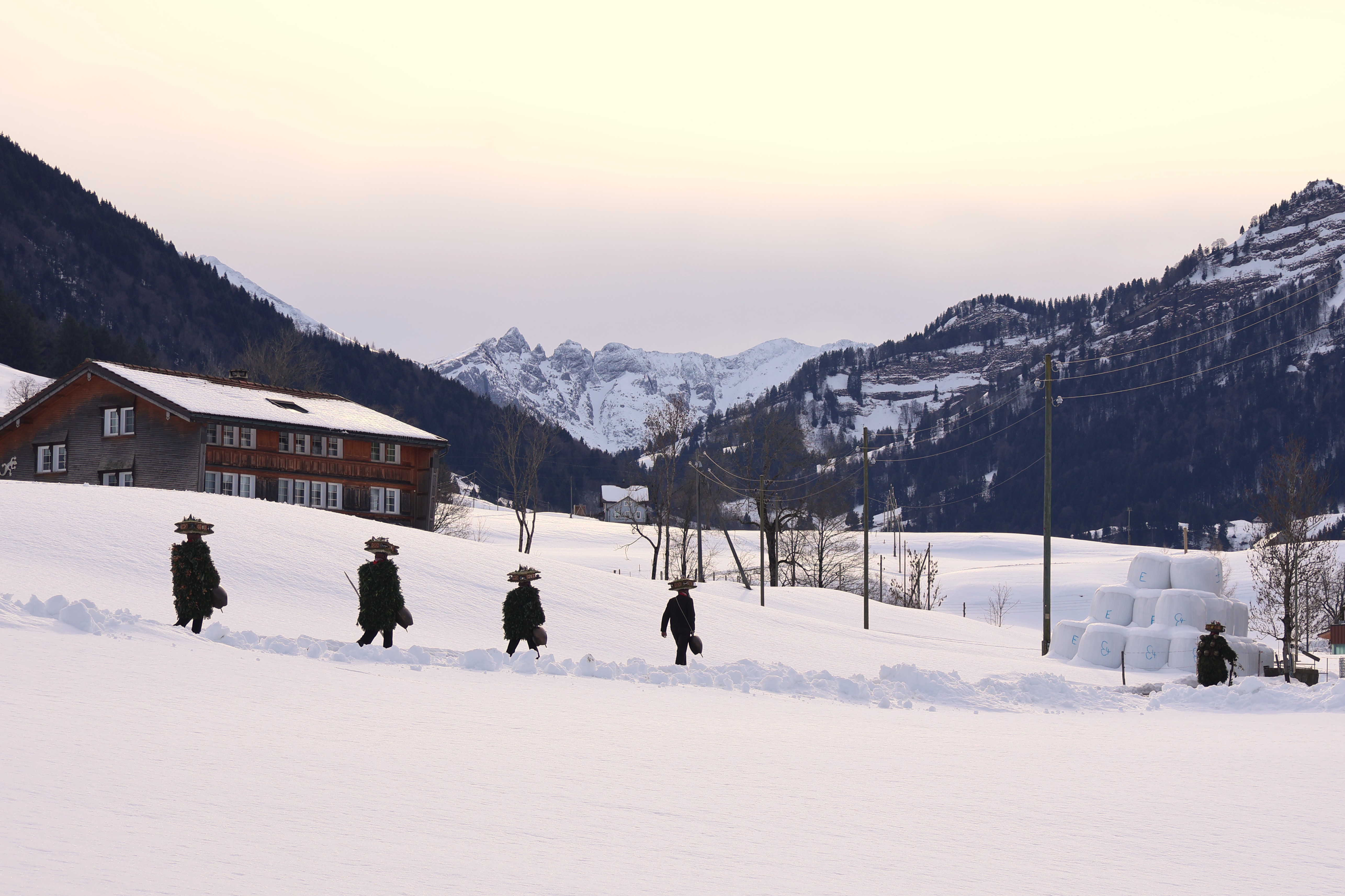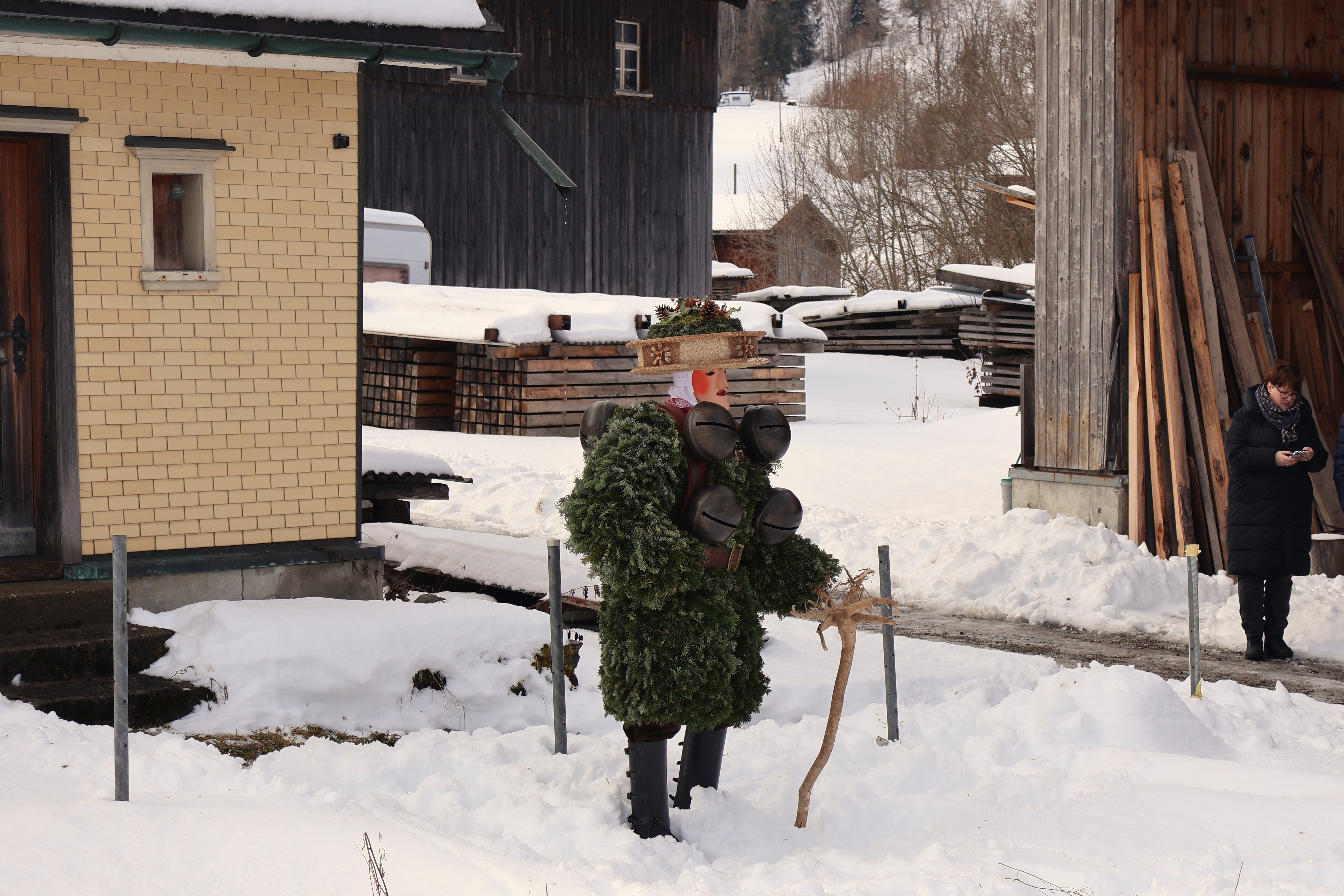 Dans la nuit, on rencontre un premier groupe d’environ 6 hommes-sapins qui chantent du yodel devant une ferme. Les fermiers sont dehors et écoutent silencieusement. A la fin de chaque chanson, les hommes-sapins se secouent faisant tinter leur grosse cloche unique ou leurs grelots. Les fermiers leur servent de l’eau, ou du vin blanc avec une paille. Après une quinzaine de minutes de chant, les hommes saluent d’une poignée de main le chef de famille qui leur glisse un billet dans la paume et s’en vont en courant à la file indienne. Ils portent des bottes en cuirs avec des boucles, sont recouverts de branches de sapin ou de gui, portent une cloche unique ou plusieurs grelots, cachent leur visage avec un masque recouvert d’écailles de pin et d’une barbe de lichen et arborent une coiffe en carton sur laquelle de petites figurines immortalisent une scène de vie locale. Dans la nuit, de petites lumières permettent de distinguer tous les détails de leur habit éphèmère.