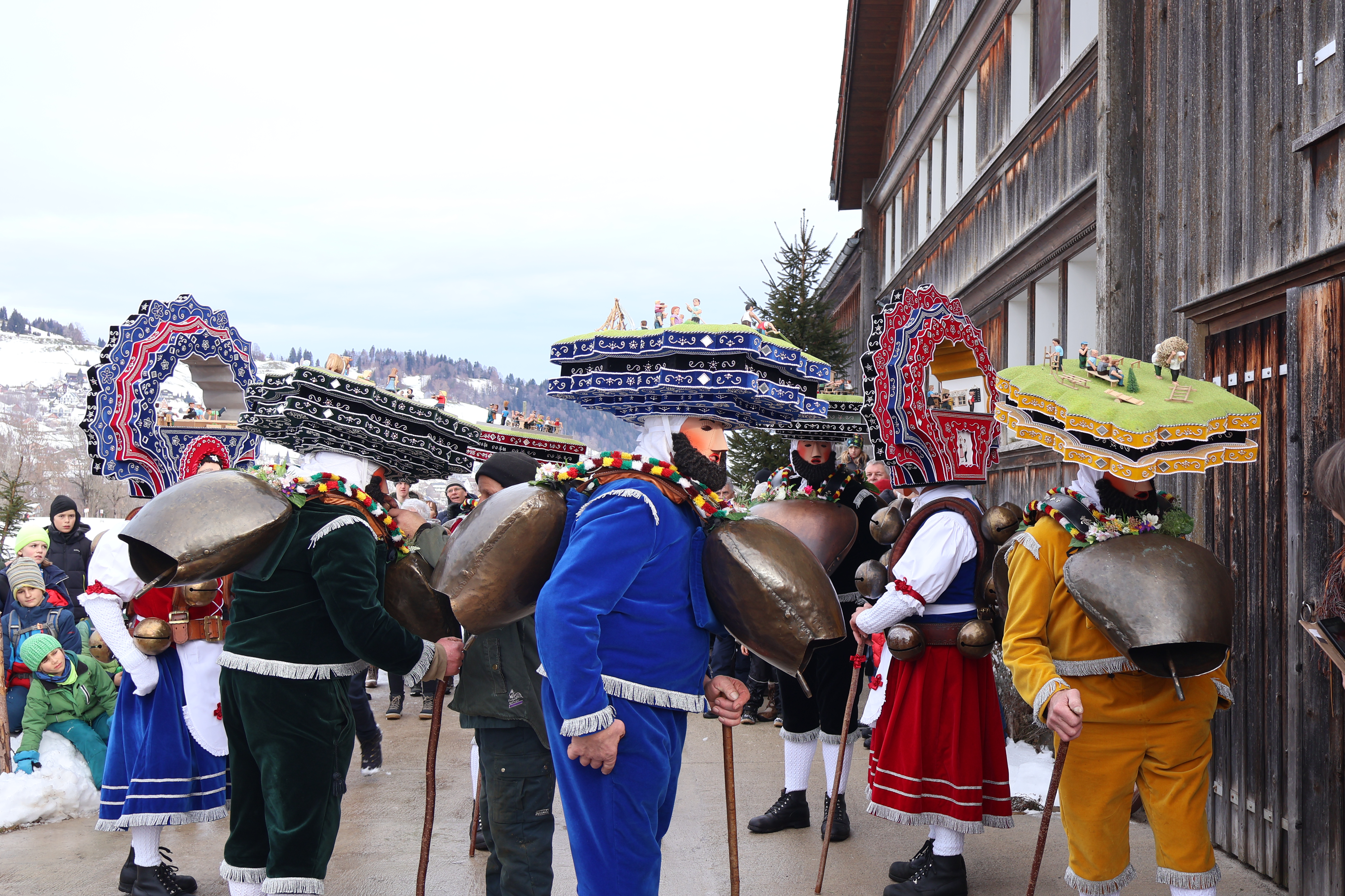 Pendant ce temps, le soleil se lève sur les collines d’Appenzell. Le monde est bleu clair. Ce n’est même pas 7h, on au mileu de la campagne, devant de vieilles fermes, à écouter du yodel, chanté par une bande de gulu portant des déguisements avec plus de détails que nos habits de tous les jours.
