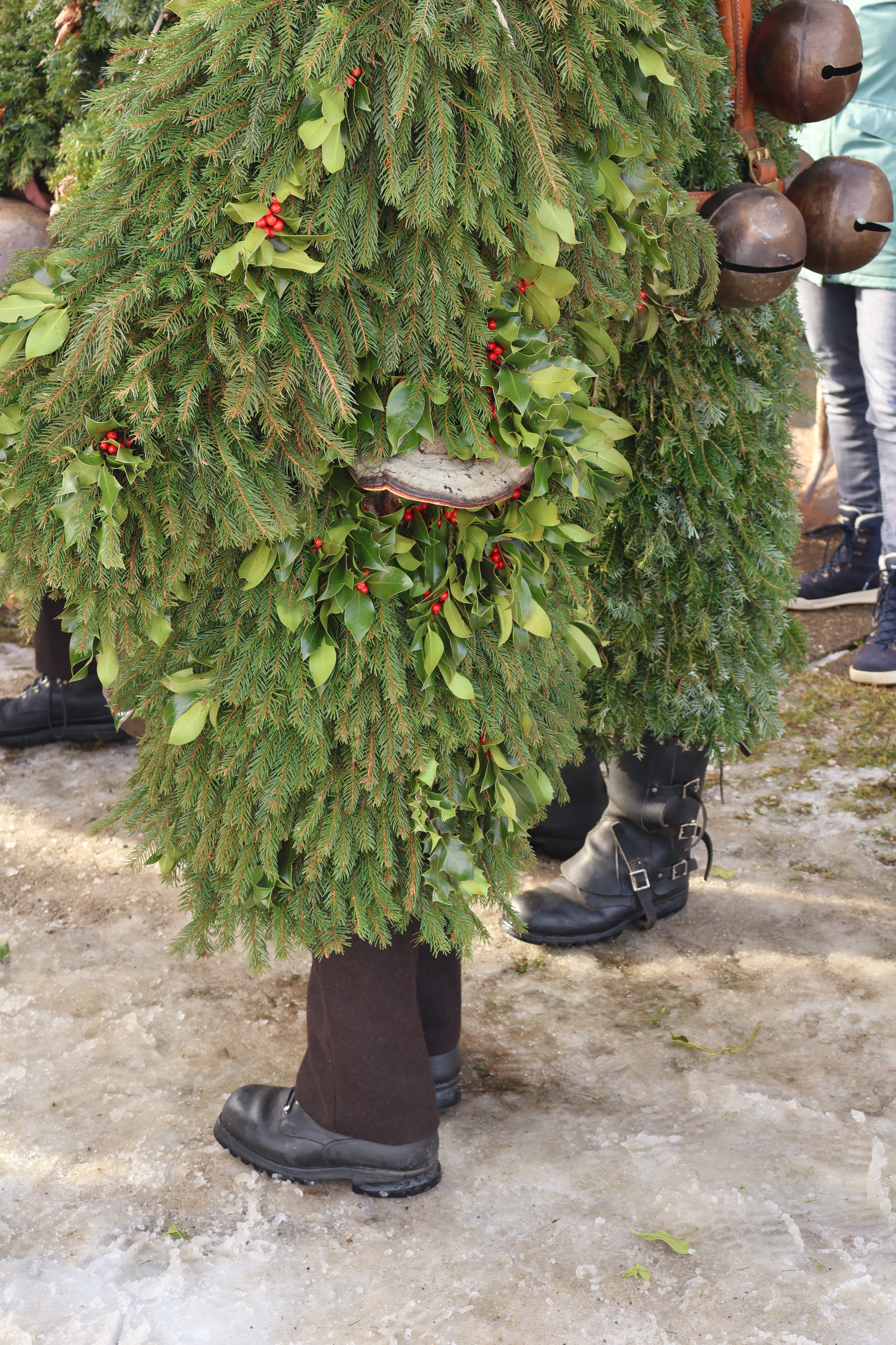 Tout a l’air très codifié, on découvre de plus en plus de détails. Ceux qui portent les grelots sont toujours couverts de sapins (et pas de gui). Dans les branchages, certains ont accrochés des champignons.