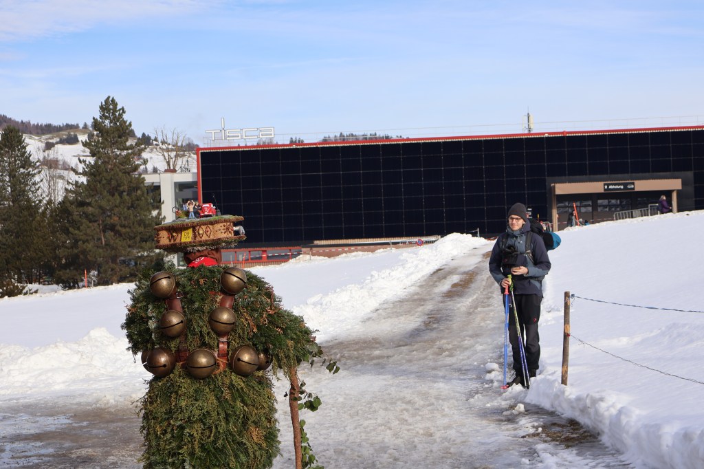 Le lendemain, on se réveille aux aurores pour attraper le premier Appenzeller Bahn qui va à Urnäsch. Il faut dire qu’on est quand même motivés pour se lever aussi tôt, sans vraiment toujours savoir où on va. Dans le train, on est rassurés de voir pas mal de monde. Nous allons probablement tous au même endroit. Arrivés dans le petit village d’Urnäsch, on suit les quelques groupes descendus du train en même temps que nous. Sur la place principale d’Urnäsch, on monte dans le premier Shuttle Bus direction la banlieu ou « Kerngebiet » Schönau. On nous a dit que pour trouver les Chlausen, il faut ensuite écouter et suivre le son des cloches. C’est ce que l’on fait. On ne tarde pas à en entendre.