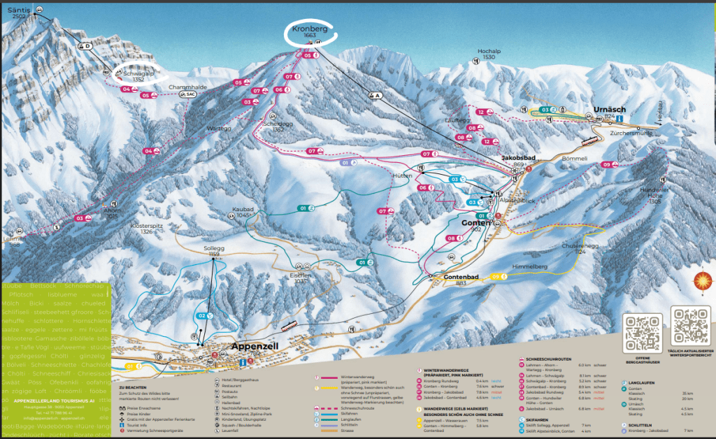 Le lundi 12 janvier 2026, on se réveille dans la ville d’Appenzell. On est arrivés en train la veille au soir, avec nos sacs à dos, nos raquettes et nos bâtons de ski sur le dos (oui, il faudra un jour investir dans des bâtons de randonnée qui se rétractent, parce que c’est pas pratique). On s’est mis d’accord sur un sentier de raquettes qui chemine sur des collines, avec vue sur le Säntis. Sur le papier c’est bien beau. Mais dans la réalité, on a rarement vu un aussi mauvais temps. Il neige, il fait -1000°C, et il y a un vent de fou furieux. Pas de quoi nous faire peur mais enfin bon…