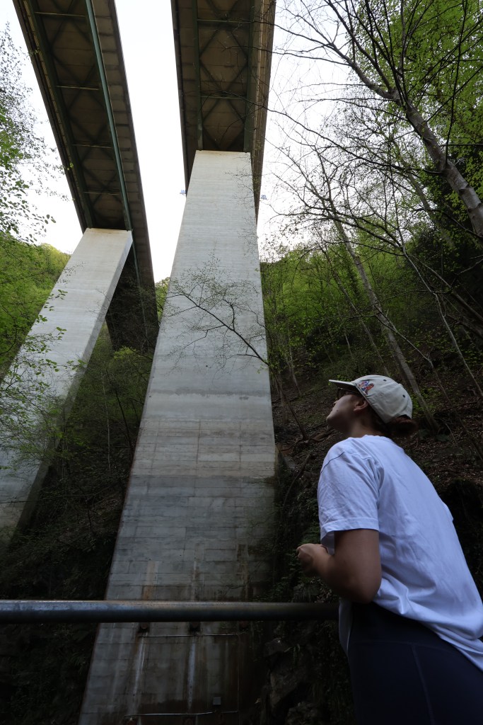 Le côté industrielle, avec l’usine, et l’autoroute au dessus donne une ambiance lugubre à l’endroit. Surtout que les rayons du soleil ne nous atteignent plus dans le fond de la gorge. Que de mystère, nous sommes curieux de la suite.