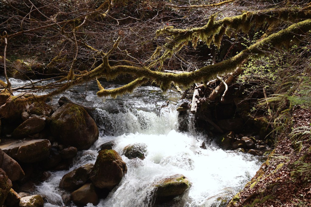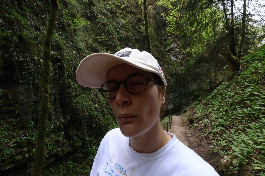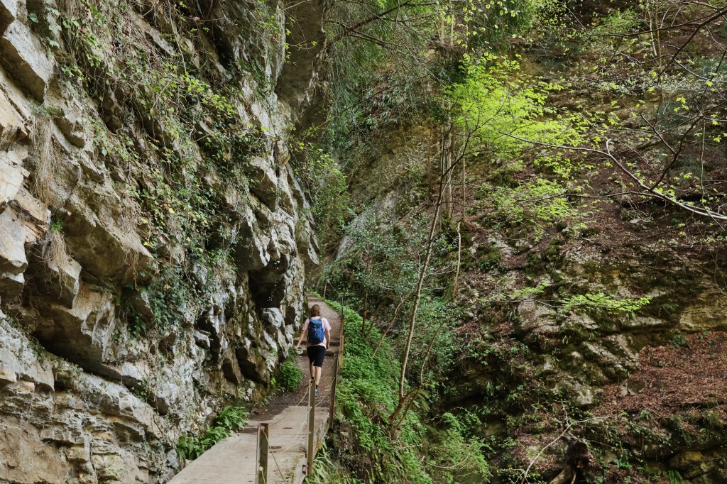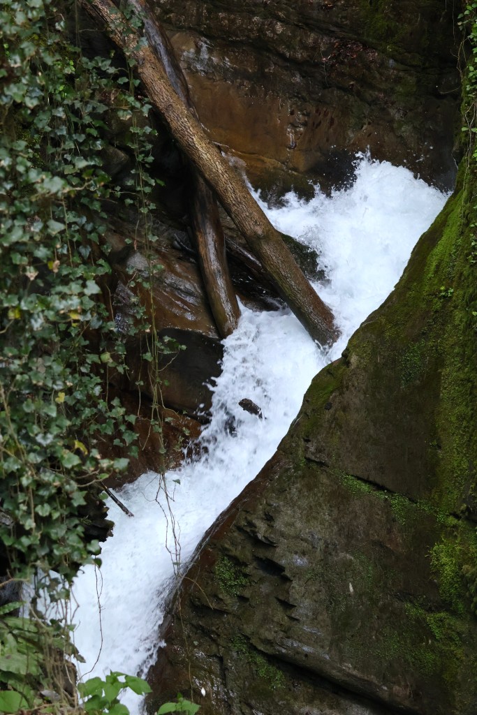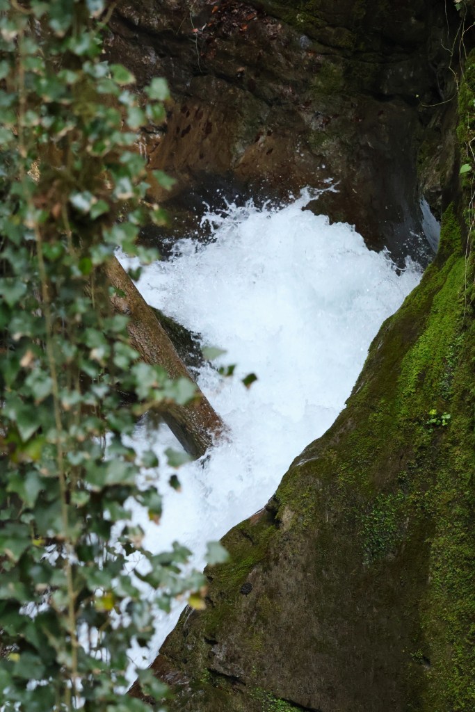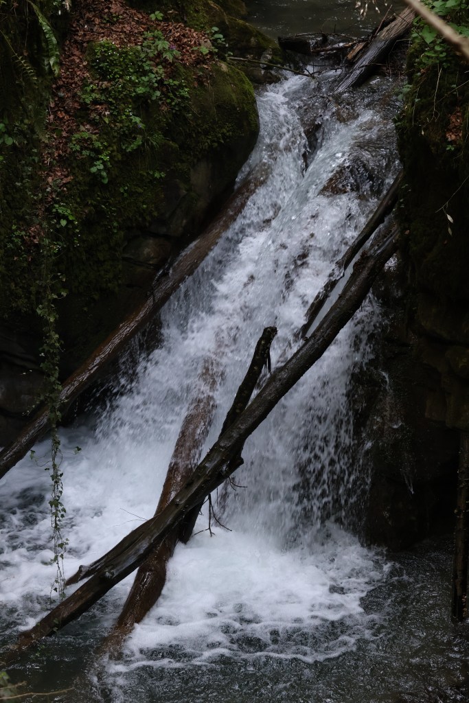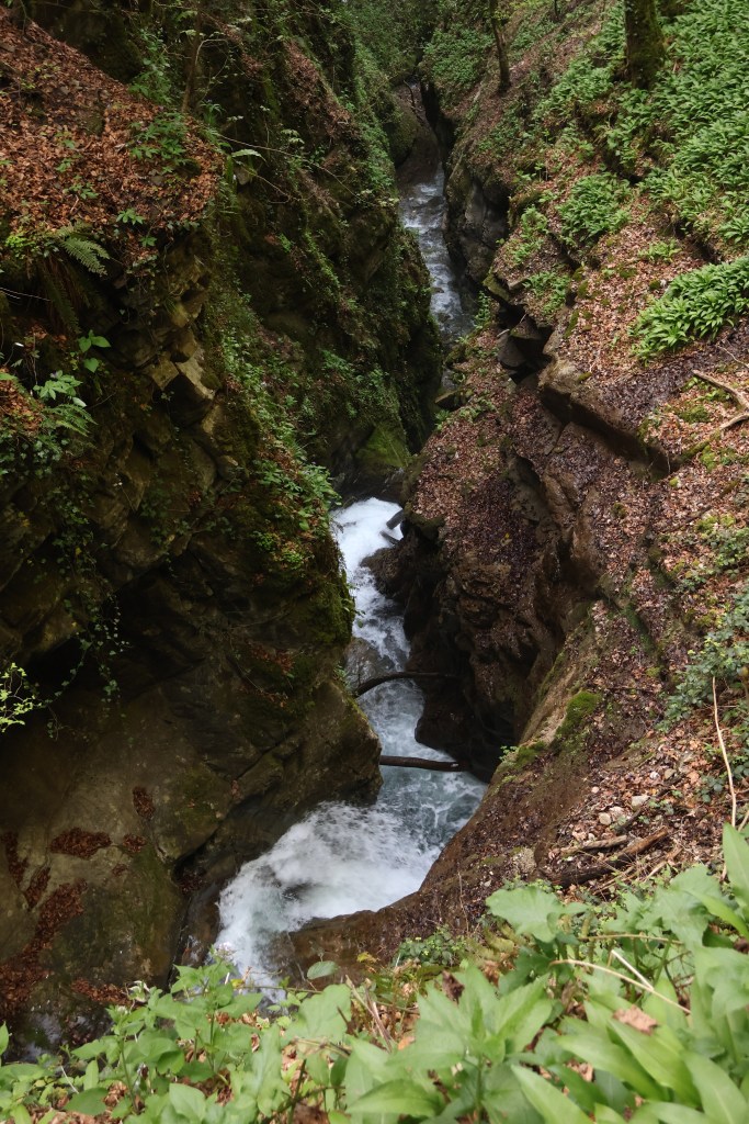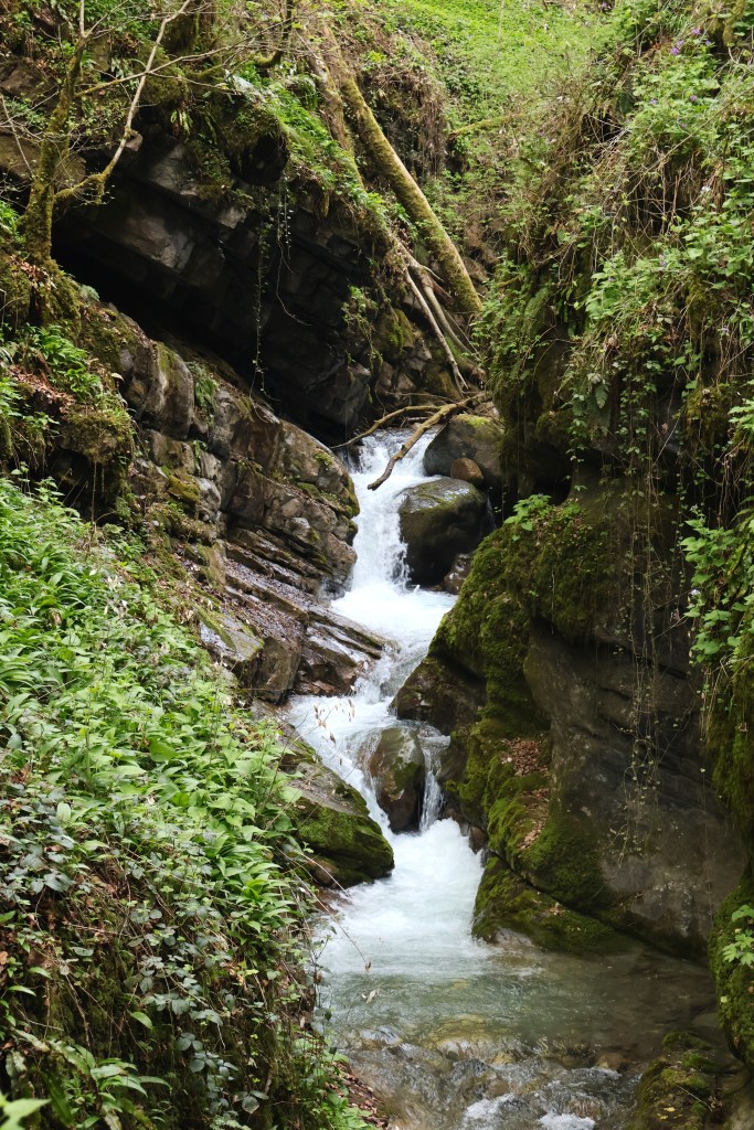La gorge se ressere rapidement. La roche est couverte de mousse et de lianes. Le taux d’humidité est certainement à >110%. La rivière est claire mais tumultueuse en ce printemps. Il n’a pourtant pas plus ces dernières semaines.